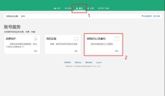 3、点击上方“服务”栏,下方找到“换购时长/流量包”,点击进入。
