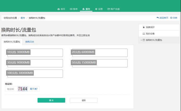 4、根据需要选择需要换购的流量包,选择好后输入验证码提交即可。